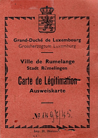 | 1945 | Ville de Rumelange, Carte de Légitimation. Dieses Exemplar wurde am 9.11.1945 ausgestellt. ![]() |