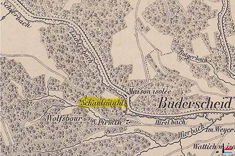 | 1862 | ![]() Schaulsmillen - Schaulsmühle - Schaulsmuhl, Kaundorf (Carte Jean-Baptiste Liesch - 1862) Wolfsbour ![]() Schaulsmuhl, Kaundorf - Buderscheidermuhl, Buderscheid - Mine d'Antimoine, Goesdorf (Carte Jean-Baptiste Liesch - 1862) |