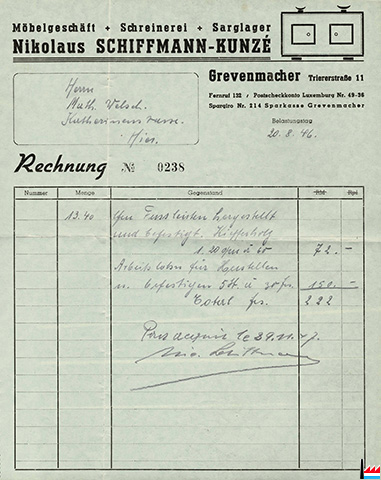 | 1946, 1947 | Möbelgeschäft - Schreinerei - Sarglager Schiffmann-Kunzé Nikolaus, 11 route de Trèves, Grevenmacher |