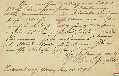 | 8.1896 | ![]() Postkarte von G.H.A. Kaufhold, Luxembourg-Gare an Schmit-Barthel, Grubenbesitzer, Rümelingen - 10.8.1896 (collection: industrie.lu) |