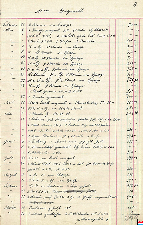 Abrechnungen der Schmiede Schmit, Bissen für das Jahr 1951 - Detail von Mme Broqueville, Château de Birtrange (Collection: industrie.lu)
