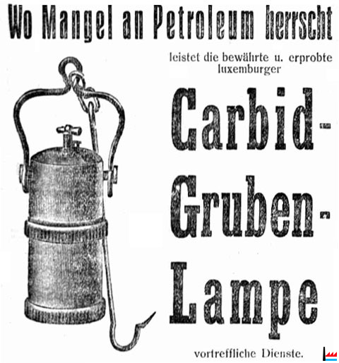 Wo Mangel an Petroleum herrscht leistet die bewährte und erprobte luxemburger Carbid-Gruben-Lampe vortreffliche Dienste