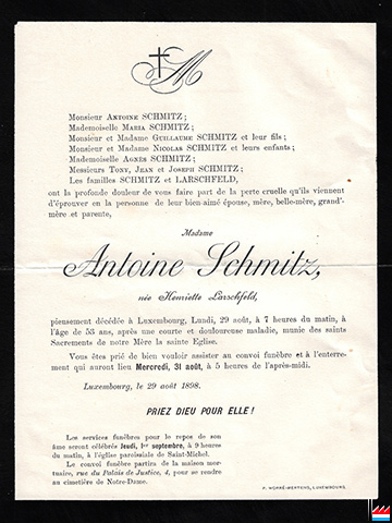 | 19.5.1866 | Mariage à Luxembourg d’Anton (Antoine) Schmitz (* 19.1.1835 à Bockenheim), serrurier, avec Henriette Larschfeld (* 22.6.1845 à Luxembourg). |
