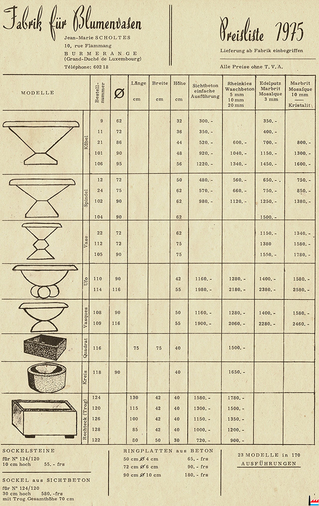 Fabrik für Blumenvasen Scholtes Jean-Marie, Burmerange - Preisliste 1975 (Collection: industrie.lu)