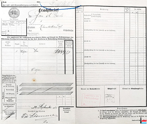 | 22.9.1905 | ![]() Frachtbrief für 1 Wagen (Essen N° 33694) 10 t Ton von Wilhelm Schommer ab Philippsheim an A. Brach, Kleinblittersdorf (Sammlung: Wilhelm Schommer) |