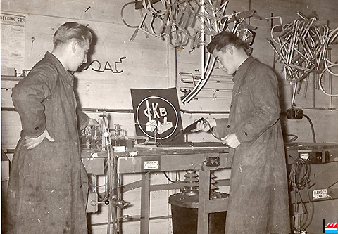 Die Gebrüder Germain Schu und Guillaume Schu in der Werkstatt, im Hintergrund ein CKB - Logo (Collection: