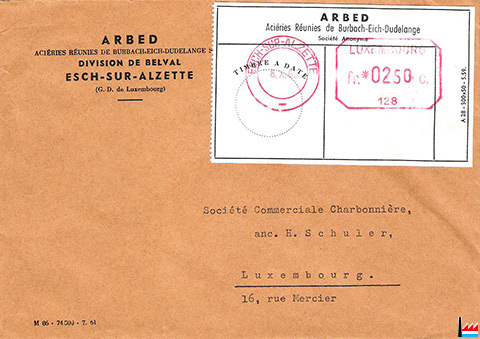 Enveloppe d'ARBED Belval à la Société Commerciale Charbonnière, anc. H. Schuler, 16 rue Mercier, Luxembourg - 8.X.1962 - 2,5 fr (Collection: Marcel Schlim)