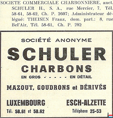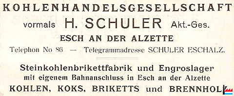 | <=1942 | Schuler A.G. Kohlenhandelsgesellschaft Kayler Pfad, Esch Tél: 2553 |