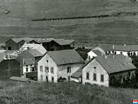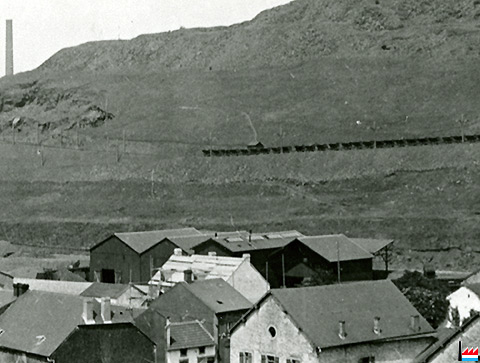 Début du quartier Neiduerf... derrière, en arrière-plan à gauche, on reconnaît bien les toitures du domaine du marchand de charbons SCHULER,... la rame de wagonnets évolue le long du Nussberg et est déjà tractée par une loco électrique; nous sommes donc au moins en 1922 (Photo collection: Marcel Schlim)