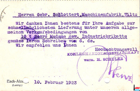 Carte postale de H. Schuler, Esch/Alzette à Gebrüder Schlottert - Wiltzer Maschinenfabrik, Wiltz - 10.2.1923 (Collection: Marcel Schlim)
