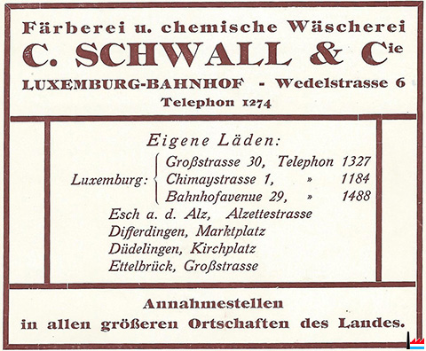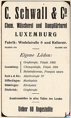 | <=1918 | C. Schwall & Cie Chemische Wäscherei und Färberei 6 Wedelstraße, Luxemburg-Bahnhof |