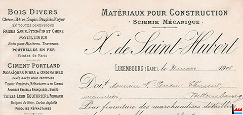 ![]() Matériaux pour construction - Scierie mécanique Xavier de Saint-Hubert, Luxembourg-Gare - facture du 31.3.1906 |