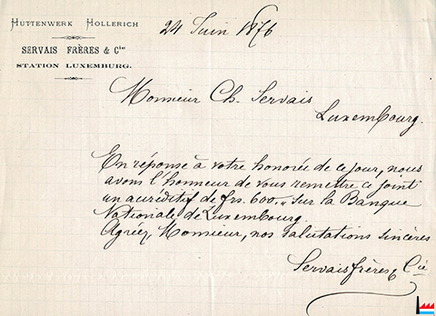 | 24.4.1876 | ![]() Servais frères & Cie, Hollerich remet un accrédtif de 600 fr à Charles Servais sur la Banque Nationale de Luxembourg (Archives Famille Servais, Luxembourg) |