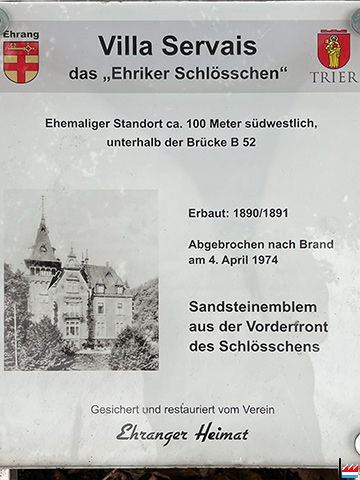 ![]() Monument - Das Servais - Collart - Emblem der Villa Servais-Collart (Ehriker Schlösschen). Ehranger Straße 230, neben der Brücke der B52 (Photos: 14.9.2022 jmo) |