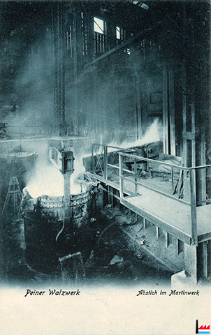 Peiner Walzwerk - Abstich im Martinwerk - 1906 (Carte postale: Verlag von Curt Rother, Peine No 50 - Originalaufnahme von W. Zirkler, Clausthal; Collection: industrie.lu)