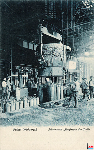 Peiner Walzwerk - Martinwerk, Ausgiessen des Stahls - 1906 (Carte postale: Verlag von Curt Rother, Peine No 49 - Originalaufnahme von W. Zirkler, Clausthal; Collection: industrie.lu)