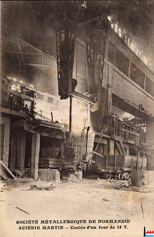 Société Métallurgique de Normandie - SMN - Aciérie Martin - Coulée d'un four de 35 t (Carte postale: Collection: industrie.lu)