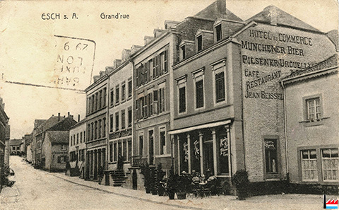 Hôtel du Commerce, Esch/Alzette, Grand'rue, Jean Beissel (Carte postale: G. Sluse, Marbrier, Esch/Alzette; Collection: industrie.lu)