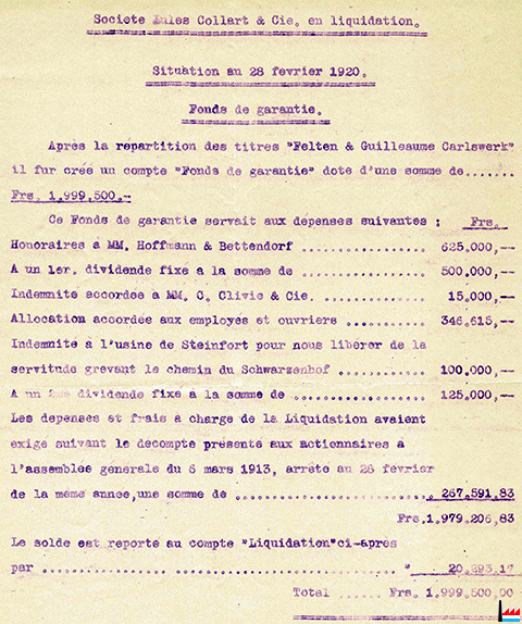 ![]() ![]() Société Jules Collart & Cie en liquidation - Situation au 28.2.1920 (Collection: Archives Servais) Répartition des titres Felten & Guilleaume Carlswerk Honoraires Hoffmann & Bettendorf Indemnité C.Clivio & Cie Loyer de la maison Pierre à Rodange |