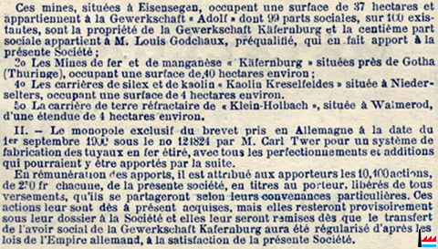 | Elisenhütte 500 PS Wasserkraft Mineralfarbenfabrik (10 t / Tag) Fabrique de tubes en fer étiré - Röhrenfabrik (30 t / Tag) Verschiedene Gebäude, Direktionsgebäude mit Büros, Wohungen für Vorarbeiter, Arbeiterhäuser Elektrische Lichtanlage 57 ha Fabrikgelände, beidseitig der Lahn, durch eine Metallbrücke verbunden Normalspuriger Gleisanschluss zum Bahnhof Nassau Eisen- und Maganerzgrube Eisensegen zur Herstellung von Mineralfarben (37 Ha Gruben, Besitz der Gewerkschaft Adolf, 99% der Anteile an dieser Grube gehören der Gewerkschaft Käfernburg, 1 % gehört Louis Godchaux der seinen Teil in die neue Gesellschaft einbringt) Eisen- und Maganerzgrube Käfernburg, bei Gotha (Thüringen) (40 Ha) Silex und Kaolin - Gruben Kaolin Kreselfeldes, in Niederselters (4 Ha) Carrière de terre réfractaire - Feuerfeste Erdegruben Kleinholbach, Wallmerod (4 Ha) Exklusivmonopol für Deutschland für das Patent N° 124824 Röhrenherstellungsverfahren (tubes en fer étiré) von Carl Twer sen., Köln - Verfahren zur Herstellung gescheißter Röhren kleineren Durchmessers |