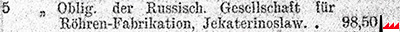 | 1914 | Russische Gesellschaft für Röhrenfabrikation. Vorstand: Michail Krawzoff (Techn., Jekaterinoslaw), Heinr. Sadée (Kfm., Moskau). - A.-R.: Vors.: Hüttenwerksbes. Georges Chaudoir (Lüttich); Stellv.: Kommerz.-R. Heinr. Eisner [Albert Hahn, Röhrenwalzw. J (Berlin); sonst. Mitgl.: Bankier L. Laveissière (Paris). Hüttenwerksbes. F. Campionnet (Paris). R. Charlier (Paris), Dr. G. Hahn (Albert Hahn] (Berlin). Jacques Chaudoir (Lüttich). - Gegr.- 1889. - Sitz in Jekaterinoslaw |