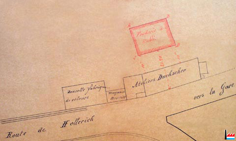 Nouvelle fabrique de velours, Magasin Mercier, Ateliers Duchscher avec Fonderie à établir (dans une partie des anciens bâtiments de la Société des Forges et Laminoirs de Luxembourg), route de Hollerich - 1872 (Document: ANLux)