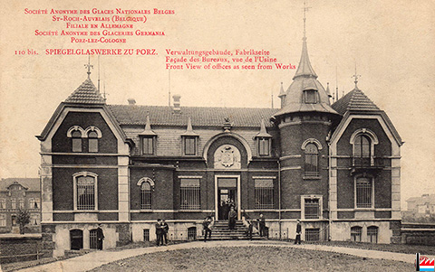Spiegelglaswerke zu Porz: Verwaltungsgebäude, Fabrikseite (110bis) (Postkarte: