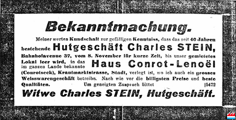 | 5.1928 | Hutgeschäft Charles Stein, Luxemburg, jetzt, Großstraße 75, vis-à-vis der Apotheke Müller |