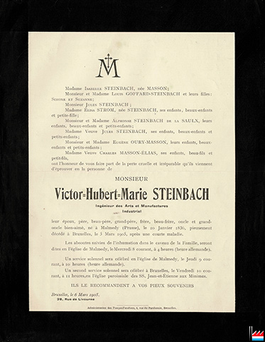 Steinbach Victor, ingénieur des Arts et Manufactures, industriel (* 20.1.1836 Malmedy (Prusse), + 5.3.1905 Bruxelles), époux de Isabelle Masson