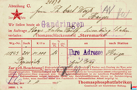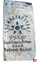 | 1917 | ![]() Garantiert reine gemahlene Thomasschlacke (In: Thomasmehl, Ernteerträge und Nahrungsmittel-Versorgung im Großherzogtum Luxemburg unter dem Kriegseinfluss) Stern Marke 16% Original-Sack mit Bleiverschluss Werbung - 1917 (Collection: industrie.lu) |