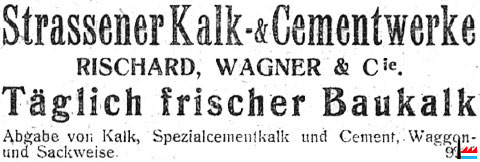 Gemahlener Kalk in Säcken Math. Bauer, in Strassen bei Luxemburg Tuffsteinziegel-Fabrik & Thomasschlacken-Mahlwerk Hydraulischer Stück-Kalk. (Stückkalk = grobkörniger gebrannter Kalk) |