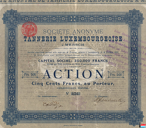 Action de 500 FR de la S.A. TANNERIE LUXEMBOURGEOISE A MERSCH - 1897 (Collection: industrie.lu)