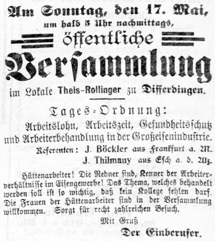 | 17.5.1908 | ![]() Öffentliche Versammlung im Lokale Theis-Rollinger, Differdingen - Referenten: J. Böckler, Frankfurt am Main; J. Thilmany, Esch/Alzette (Arme Teufel: 17.5.1908) |