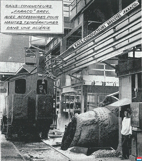 1955 - Rails-conducteurs FARACO brev. avec accessoires pour hautes températures dans une aciérie - Dans: "Luxembourg - Au service du Congo" - Publié par le Service d’expansion économique avec la collaboration de la Fédération des industriels, 1955, Imprimerie Bourg-Bourger, Luxembourg (Collection Charles-Louis Aschman)