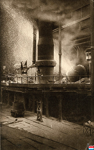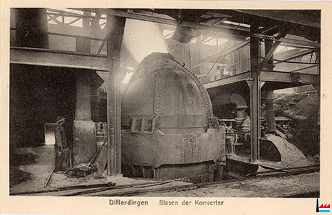 Hütte Differdingen - Einleeren der Charge im Konverter (Carte postale: Verlag Ch. Grieser, Hofphotograph, Luxemburg, 1916; collection: industrie.lu)