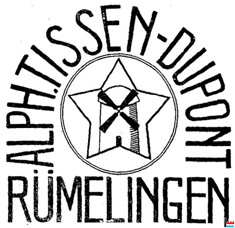 | 1914 | ![]() Marque de fabrique N° 2780. - 27. März 1914. - Alphons Tissen - Dupont aus Rümelingen. - Die Marke stellt einen fünfeckigen Stern dar, in dessen Mitte sielt eine Windmühle befindet und welcher von einer doppelten Kreislinie eingefaßt ist. Um das Ganze ist die Firmenbezeichnung «Alph. Tissen-Dupont Rümelingen » portalförmig disponiert.- Sie wird in allen Grüßen und Farben, flach, hohl oder erhaben, allein oder in Verbindung mit andern Worten, Schriftzeichen, sowie Verzierungen, auch auf den Umhüllungen und Behältern der Waren gebraucht, zur Unterscheidung von Brauselimonaden, Mineralwasser und ähnlichen Getränken. |