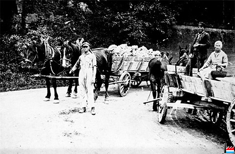 ![]() Geladener Tonwagen (Kutscher Fritz Kohl) auf dem Weg zum Bahnhof Speicher. Das Bild ist in der scharfen Kurve vor den Schienen und der Brücke über die Kyll. (Sammlung: Wilhelm Schommer) ![]() Tongrube bei der Kreuzkapelle in Speicher - der Betreiber Valentin Consdorf sitzend in der Mitte des Bildes Bis ein wenig unter seinen Füssen geht der Abraum und erst dort beginnt die helle Tonschicht (Sammlung: Wilhelm Schommer) |