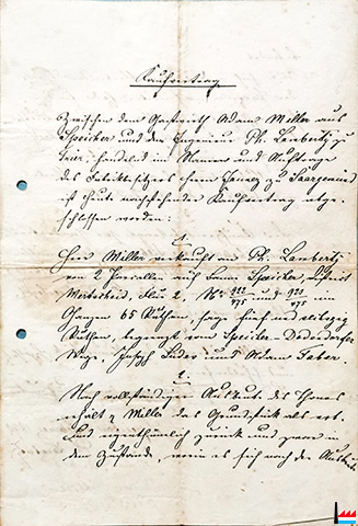 | 9.2.1872 | ![]() Kaufvertrag von 2 Parzellen auf Banne Speicher, Distrikt Mertscheid zwischen Adam Miller, Gastwirt, in Speicher und Ph. Lamberty, Ingenieur, in Trier, handelnd im Namen und Auftrage des Fabrikbesitzers Herrn Jaunez, Saargemünd. Nach vollständiger Ausbeute des Tones erhält Miller das Grundstück als erblich und eigentümlich zurück und zwar in dem Zustande, worin es sich nach der Ausbeutung befindet ... Der Kaufpreis beträgt 3 Thaler 10 Silbergroschen / Quadratrute (Quadratruthe) mithin für 65 Ruten (Ruthen): 216 Thaler 20 Silbergroschen .... (Sammlung: Wilhelm Schommer) |