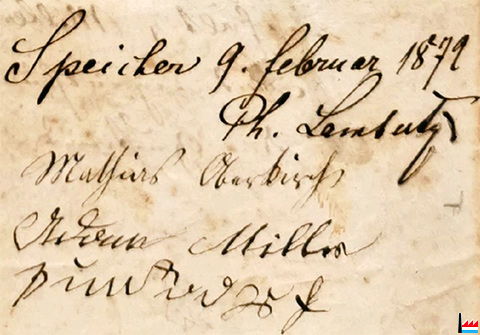 | 25.1.1883 | ![]() Kaufvertrag eines Grundstücks (9 Ar 87) auf Banne Speicher links am Kapellenweg - zwischen Johann Ludes, zu Speicher und dem Fabrikdirektor von Bohuszewicz zu Wasserbillig, handelnd im Namen und Auftrage des Fabrikbesitzers Herrn Jaunez, Saargemünd. Bis zur Beginn der Thonausbeutung durch den Käufer, was ganz nach seinem Wunsche jeder Zeit geschehen kann, verbleibt das Grundstück in Nutzniessung des Verkäufers, es steht jedoch dem Käufer das Recht zu, ohne jede Entschädigung, Abfuhrwege und Wasserläufe anzulegen ... Kaufpreis: 1077 Mark ... gezeichnet u.a. Consdorf (Sammlung: Wilhelm Schommer) |