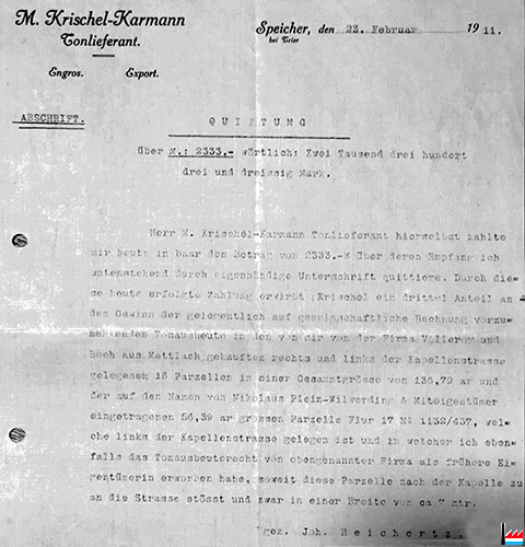 | 29.8.1907 | ![]() Kaufvertrag der Tonausbeute aus einem Teile des zu Binsfeld gelegenen sogenannten Bruderfeldweges in seiner ganzen Länge (46 m) und Breite, insoweit derselbe an das Eigentum der Firma Rieff & Bauer angrenzt, von den Vereinigten Servais Werke A.G. an die Firma Rieff & Bauer vom 8.3.1907: Kaufpreis bei 100 Mark / Quadratrute bei einer Fläche von 13,5 Ruten: 1350 Mark nebst Zinsen zu 4% / Jahr vom 8.3.1907. (Sammlung: Wilhelm Schommer) Er ist unterschrieben für die Vereinigten Servais Werke A.G.: Paul Servais, Ingenieur zu Ehrang, und Curt von Pelchrzim, Ingenieur zu Ehrang und für die Firma Rieff & Bauer: Johann Rieff, Kaufmann zu Merzig |