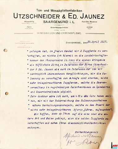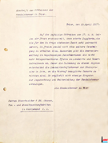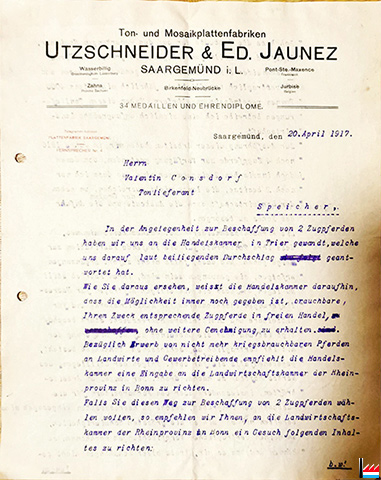 In der Angelegenheit zur Beschaffung von 2 Zugpferden haben wir uns an die Handelskammer in Trier gewandt, welche uns darauf laut beiliegendem Durchschlag geantwortet hat. Wie Sie daraus ersehen, weisst die Handelskammer daraufhin, das die Möglichkeit immer noch gegeben ist, brauchbare, Ihrem Zweck entsprechende Zugpferde im freien Handel, ohne weitere Genehmigung, zu erhalten. Bezüglich Erwerb von nicht mehr kriegsbrauchbaren Pferden an Landwirte und Gewerbetreibende empfiehlt die Handelskammer eine Eingabe an die Landwirtschaftskammer der Rheinprovinz in Bonn zu richten. Falls Sie diesen Weg zur Beschaffung von 2 Zugpferden wählen wollen, so empfehlen wir Ihnen, an die Landwirtschaftskammer der Rheinprovinz in Bonn ein Gesuch folgenden Inhaltes zu richten: "Ich habe die Ausbeute der auf den Gemarkungen Speicher, Binsfeld und Beilingen gelegenen Tongruben der Firma Utzschneider & Ed. Jaunez in Saargemünd übernommen und mich vertraglich verpflichtet, jährlich mindestens 4.000 Tonnen regelmässig anzuliefern. Neben diesen Tonlieferungen betreibe ich eine ziemlich umfangreiche Landwirtschaft. Die Firma Utzschneider & Ed. Jaunez teilt mir mit, dass ihre Tonvorräte für die laufende Fabrikation zur Neige gehen und dass, falls nicht sofort Ergänzungen erfolgen, sie gezwungen sein wird, ihren Betrieb still zu legen, - dass sie mit eiligen Aufträgen für Heereslieferungen insbesondere für Munitionswerke und für mittelbare und unmittelbare Heereszwecke stark beschäftigt ist und dass sie unbedingt auf der Lieferung der mit ihr vertraglich abgeschlossenen Tonmengen besteht, gegebenenfalls sie mich für evtl. Folgen der Stilllegung des Werkes haftbar zu machen droht. Der Mangel an Arbeitskräften, insbesondere aber von Facharbeitern für die Ausbeute der Tongruben, welche zu Heereszwecken eingezogen sind bereiten mir sowieso die grössten Schwierigkeiten, um meinen vertraglichen Verpflichtungen nachkommen zu können und, da es mir, trotz aller Bemühungen nicht gelungen, im freien Handel mir 2 Zugpferde zu verschaffen, so richte ich hiermit an die Landwirtschaftskammer der Rheinprovinz in Bonn die ebenso dringende wie höflichste Bitte, im Interesse der Heereslieferungen der Firma Utzschneider & Ed. Jaunez, wie auch im Interesse meiner Landwirtschaft und der von mir vertraglich übernommenen Verpflichtungen, mir die Zulassung zu verschaffen zum Ankaufe von 2 starken, nicht mehr kriegsbrauchbaren Zugpferden, welche die Heeresverwaltung in regelmässigen Zwischenräumen an Landwirte und Gewerbetreibende abgibt. Sehr dankbar wäre ich auch, wenn Sie die Güte haben wollten, mir mit der Überreichung des Zulassungsscheines nähere Verhaltungsmassregeln, welche zu dem Erwerb nicht mehr kriegsbrauchbaren Pferde führen, aufzugeben." Wir hoffen, dass es Ihnen auf die eine oder die andere Art und Weise gelingt, sich die beiden Zugpferde zu verschaffen und sehen Ihren diesbezüglichen Nachrichten entgegen. Hochachtungsvoll, Utzschneider & Jaunez