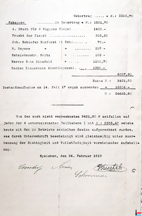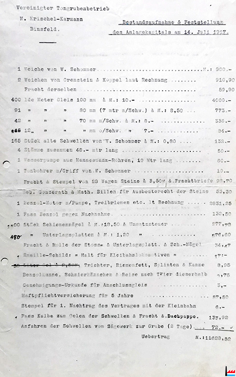 | 31.12.1917 | ![]() Vereinigter Tongrubenbetrieb M. Krischel-Karmann, Binsfeld - Bestandsaufnahme 31.12.1917 (Sammlung: Wilhelm Schommer) |