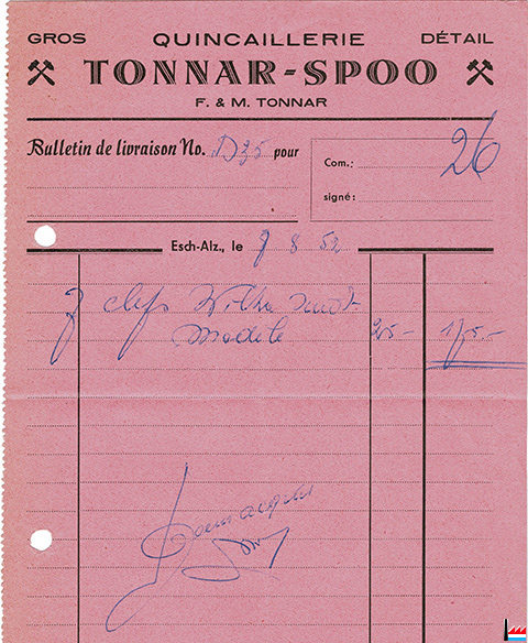 ![]() Quincaillerie Tonnar-Spoo - facture du 8.8.1952 (Collection: industrie.lu) F. & M. Tonnar Esch/Alzette |