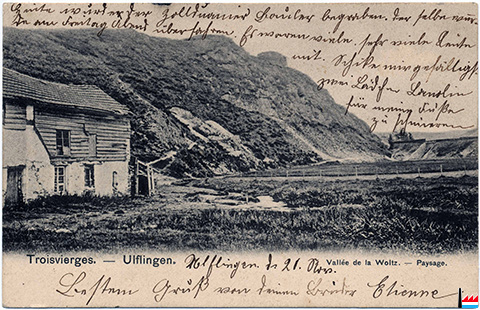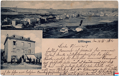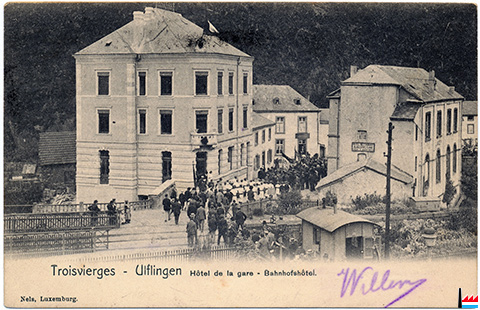 | 9.1904 | Ulflingen. 7. Sept. 1904 - Das Konsumgeschäft, das hier der Verein der Eisenbahnbeamten für seine Mitglieder errichtet hat, geht außerordentlich gut. Die Laienbrüder von Fünfbrunnen haben das hiesige geräumige Haus des Hrn. Gillen angekauft: man spricht davon, als seien sie entschlossen, darin Werkstätten einzurichten für Handwerker jeder Art, die ihre Kongregation liefern soll. Dies und das Konsumqeschäft sind Pläne, von denen die hiesigen Geschäftsleute nicht sehr erbaut sind. (OMZ: 13.9.1904) |