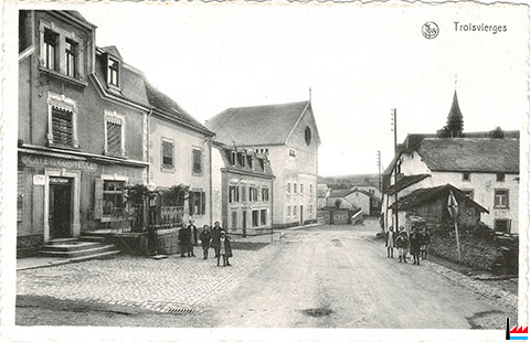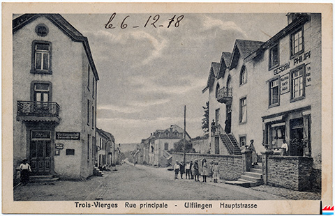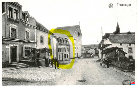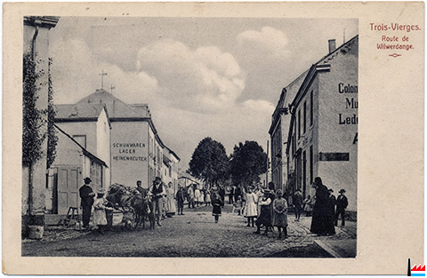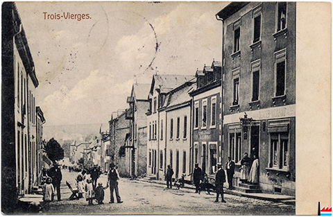 Rechts Café N. Schrantz, dat ass haut ee Wunnhaus op 5 rue de Wilwerdange L-9912 Troisvierges Lénks „Warenhaus E. Oberlinkels“, steet nach an haut sinn Appartementer dodran, dat ass haut op 2 rue de Wilwerdange L-9912 Troisvierges |