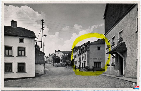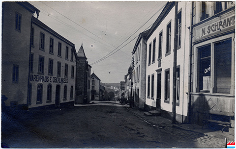 Rechts Café N. Schrantz, dat ass haut ee Wunnhaus op 5 rue de Wilwerdange L-9912 Troisvierges Lénks „Warenhaus E. Oberlinkels“, steet nach an haut sinn Appartementer dodran, dat ass haut op 2 rue de Wilwerdange L-9912 Troisvierges
