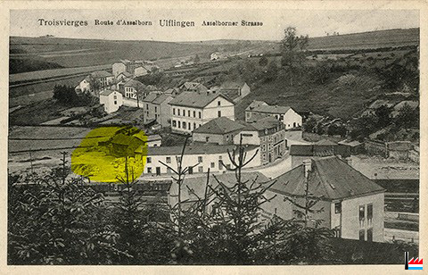 ![]() Troisvierges, route d'Asselborn - Ulflingen, Asselbornerstraße - 1918? (Carte postale: Manufacture de cartes P. Houstraas, Luxembourg, Rue des Augustins, Nr 3; collection: industrie.lu) |