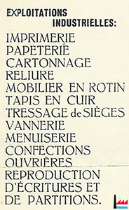 Exploitations industrielles : imprimerie, papèterie, cartonnage, reliure, mobilier en rotin, tapis en cuir, tressage de sièges, vannerie, menuiserie, confections ouvrières, reproduction d’écritures et de partitions. - Bureaux industriels : 26, rue Munster.