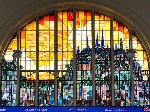 | 5.1951 | ![]() Die Belgopharma und der Direktor der Publicité Reclam, Ing. Michel Ungeheuer und ein belgischer Reklamekünstler und unser Luxemburger Maler Frantz Kinnen (1905 - 1979) und der Luxemburger Farbglasspezialist Linster sind zusammen verantwortlich für das herrliche neue Vitrail im Bahnhof Luxemburg, das in dieser Reklame echte Kunst beherbergt. Jedermann ist darob beglückt: die von der Eisenbahn, deren zahllos belebte Halle ein elegantes «domartiges» Cachet hat; die Bayer-Gesellschaft, deren universales Aspirine in allen Farben herabtänzelt in den Raum und ganz besonders unser Freund Michel Ungeheuer, der den auf 10 Jahre laufenden Vertrag zwischen der CFL-Verwaltung und der Belgopharma vermittelte. Das Vitrail hat eine Fläche von 30 Quadratmetern, es besteht aus 220 «panneaux» mit etwa 2000 Glasparzellen. 160 kg Blei waren erforderlich für die Einfassung der Glasstückchen. (Revue: 26.5.1951) ![]() Vitrail réalisé par Linster - Mondorf, sans la publicité BAYER Aspirine, à la Gare de Luxembourg (Photo: 1.3.2025 jmo) |