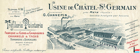 | <=1922 | ![]() Usine de Châtel-St-Germain, près Metz S.A. - <=1922 (Collection: industrie.lu) Tél.: 99 Tréfilerie - Pointerie Fabrique de clous de chaussures Channels & tacks Ferronnerie & Quincaillerie Ressorts élastiques pour meubles Ronce artificielle, grillage mécanique Chaînes électriques ordinaires & estampées Chaînes forgées à la main |